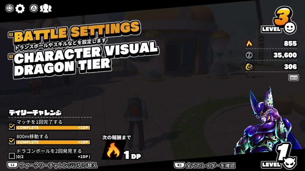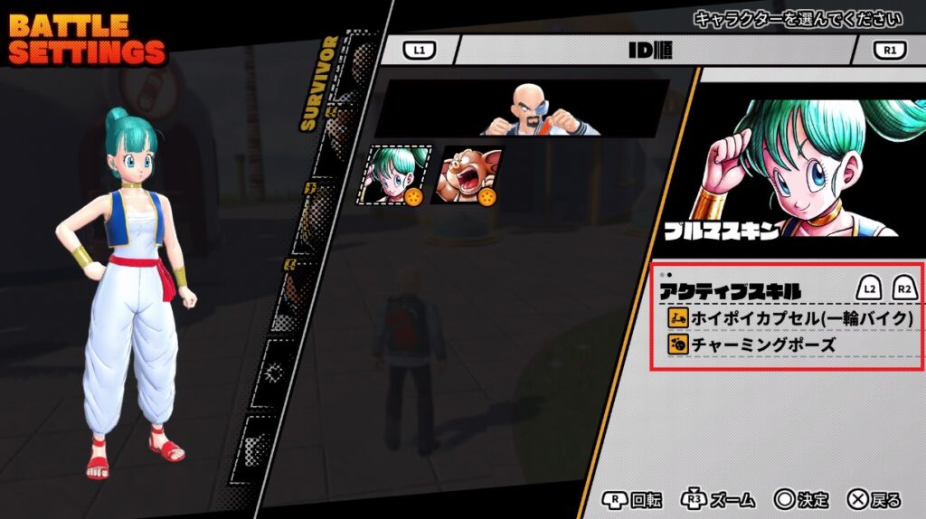 例えば、最初から持っているスキンのブルマは、アクティブスキルとして「ホイポイカプセル(一輪バイク)」と「チャーミングポーズ」を持っていますが、これらはスキンを変更するだけでは使えるようにならないということです。