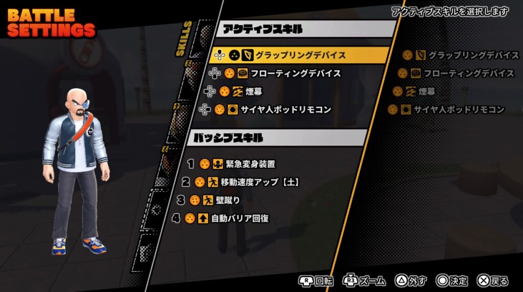 下から2番目のパンチマークみたいなところを選択すると、ここでいろいろとスキルをセットできます。スキルにはアクティブスキルとパッシブスキルがあり、アクティブスキルは十字キーに設定しゲーム内で操作が必要。パッシブスキルはセットしておけば自動的に反映されるスキルのことです。