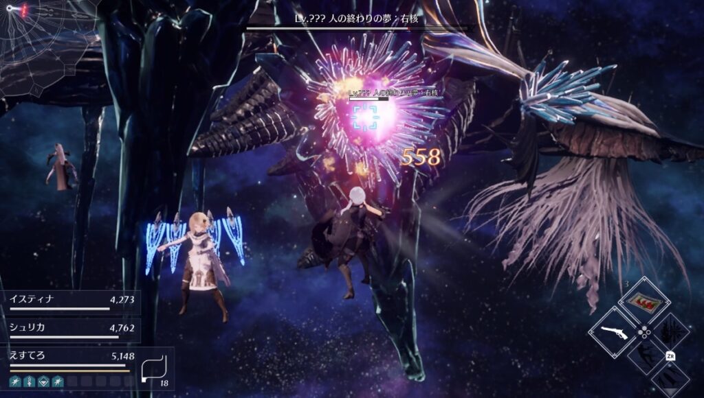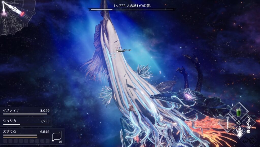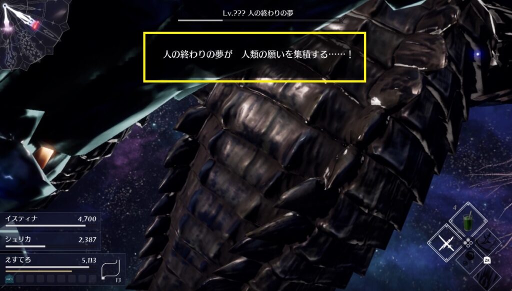 「人の終わりの夢が 人類の願いを集結する…!」の表示のあとに全範囲の大ダメージが飛んできます。専用のカットシーンになって操作を受け付けないので、カットシーン前に回復アイテムでHPを高くしておくこと。2500くらいのダメージだったのでHP次第では死にます。