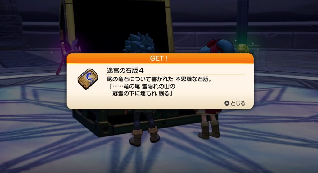 メインクエスト「雪隠れの尾」の発生タイミングは竜玉の迷宮B2Fのクリア時です。この時に迷宮の石版4を入手し、そのままクエストが発生することになります。