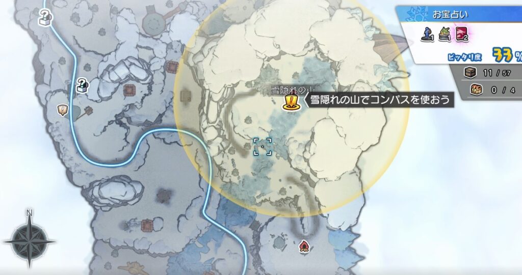 マップに表示された黄色の範囲に入ると画面にメッセージが出ます。この後はお宝コンパスを使いながら目的のお宝である「尾の竜石」を探していきます。