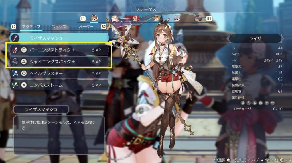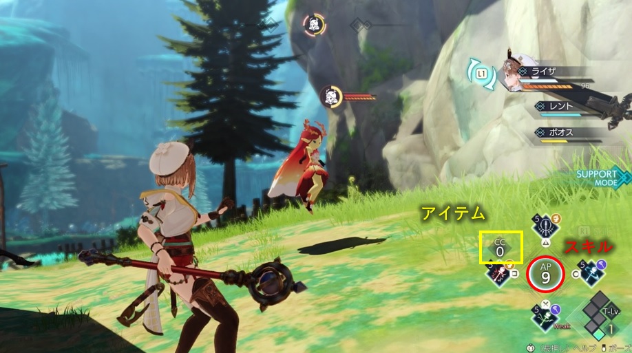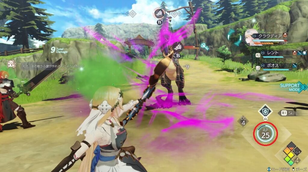 パーティメンバーの作戦を十字キーの上下で「アクティブモード」「サポートモード」の切替が出来ます。アクティブモードにするとメンバーが凄い勢いでAPを消費する為、自キャラが通常攻撃しかできない…ってことになりがちです。
