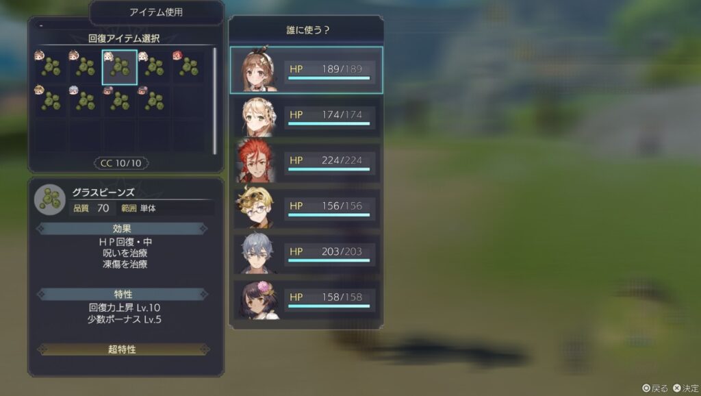 ここでもアイテムを使用するのにCCが必要ですが、バトルで消費しきれなかったCCはCCボトルといういうところに蓄積されます。ここからCCを使用して戦闘後に回復を行いましょう。