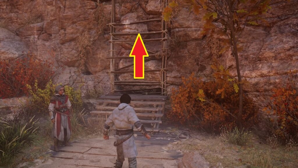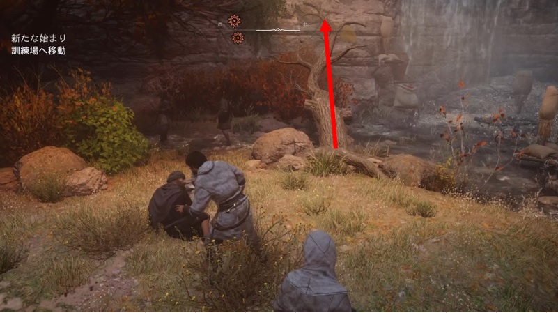 投げナイフの練習場の横の木を伝って岩場を登っていく。登った後は木の足場をジャンプで渡って行きますが、落ちるとダメージ&登りなおしなので注意。
