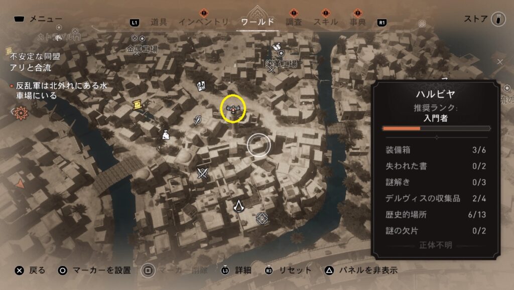 ビューポイントはマップを開くと鷲のマークで表示されています。鷲の胸あたりにオレンジの印が付いていればシンクロをして解放してあるということです。