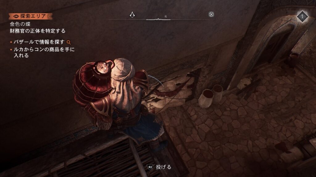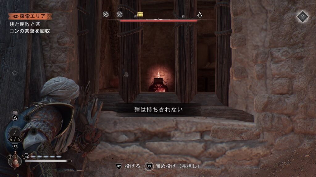 2階の木の格子窓の隙間から投げナイフで油壺を爆発させる。これで2階の木窓が破壊されるのでそこから中に入れば戦闘なしで茶葉を回収できる。