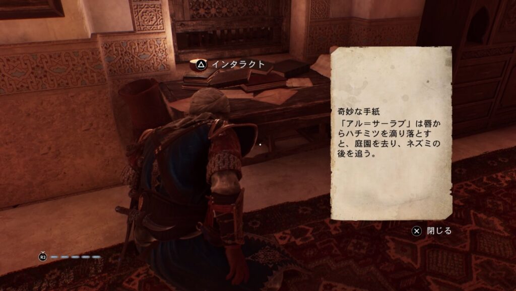 ・部屋の中で地図・香水・髪飾り・アリブの詩を調べる
