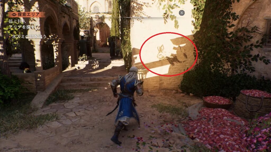 画像のネズミの絵まで来たら、後を向いて布が掛かっている通路へ入ると最後のネズミのところに辿りつける。