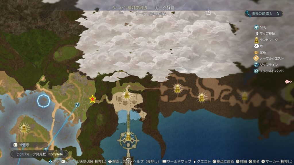 先ほどイベントがあった地点から南西方面へ進み★のあたりでイベント。ランドマークを解放するまでは雲で隠れてマップが見えないと思うので、地形は↑の画像を参考に。