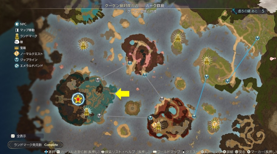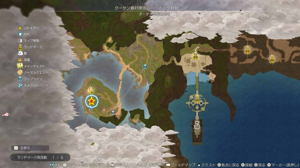 目的地は↑の画像を参考に。島の東側に砂浜から続く階段があってそこから島の中へと進んで行ける。ここにはランドマークが6か所あり解放すると同時に全ての場所でノーマルクエストが発生します。