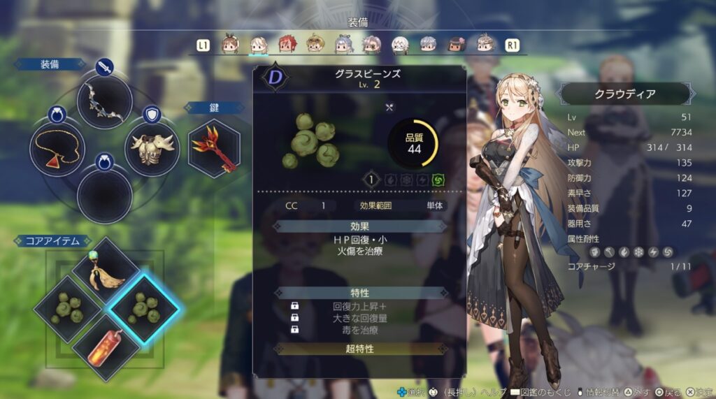 特性というのはアイテムなどに個別につけられる追加効果みたいなもの。序盤で適当に調合をしていると、「特性の欄に効果の記載はあるがロックが掛かっている状態…」ってことになりがちです。