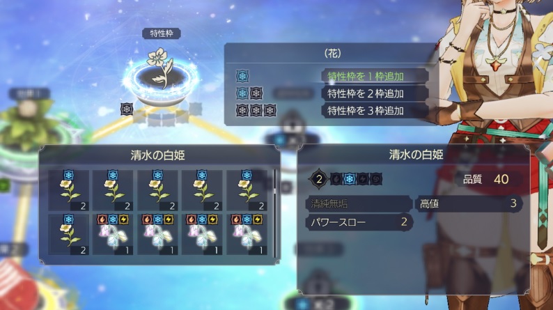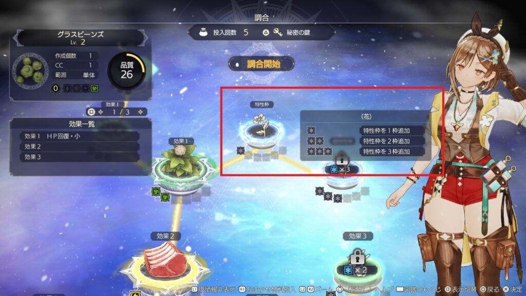 特性の部分のロック表示がなく全ての効果がアクティブになってます。ただ、序盤は特性の効果自体もそこまで強くないですし、特性枠を考慮すると調合の手順も歪んでくるのでそこまで意識しないでいいと思います。