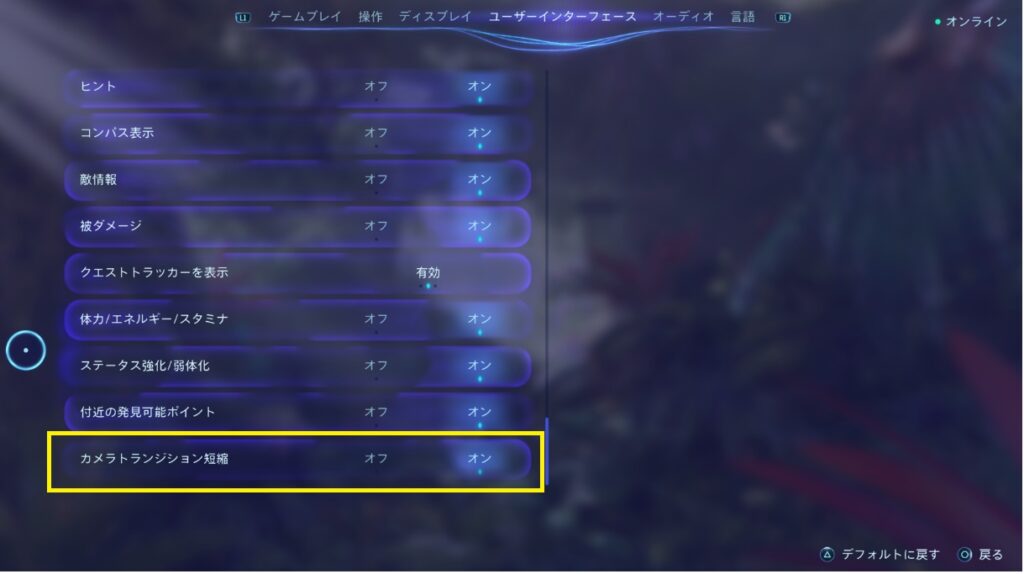カメラアニメーション強度を下げても酔いにくくなるみたいなんだけど、個人的にはこちらはあまり変化を感じとれませんでした。