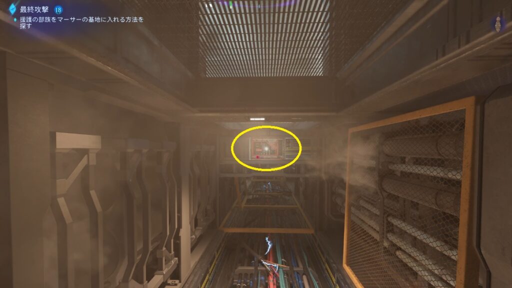 一旦外に出た後は画像の位置を目指して登り部屋の中の端末をハッキングする。