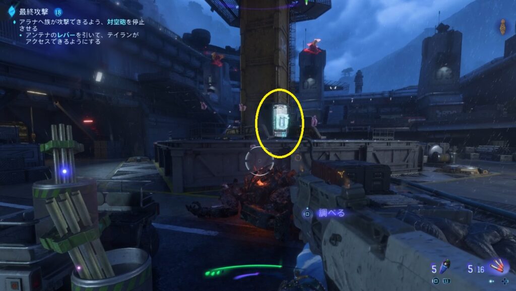 - 橋を渡り基地にあるアンテナのレバーを下げる