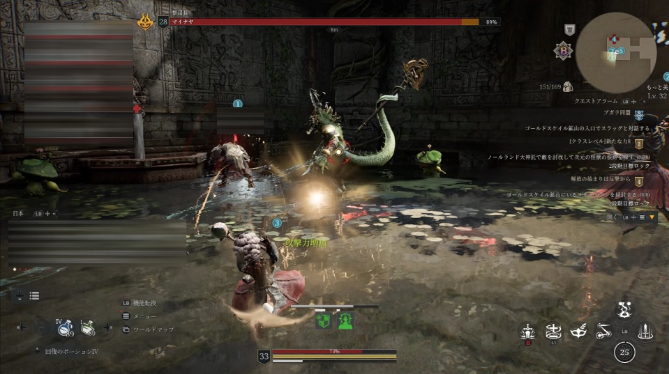 頭上にマークがついた人がターゲットとなり、本体から金貨の連打攻撃が飛んできます。この間は本体への攻撃が無効なので、湧いてきたカエルの大群の殲滅に専念する。