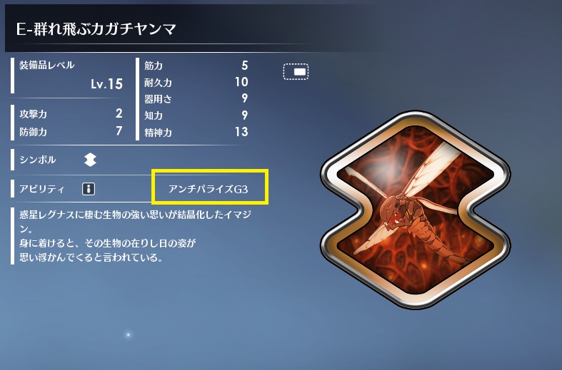 麻痺がかなり鬱陶しい為、アンチパライズを持つエンハンスイマジンで対策をしておくといいです。管理人は【群れ飛ぶカガチヤンマ】を装備しました。