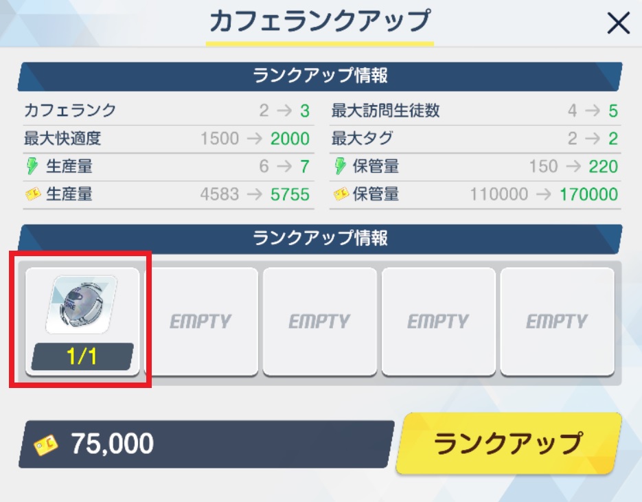 カフェをランクアップさせるために必要な素材はノーマル3-5、6-5、9-5、12-5の初回クリア報酬で確認。