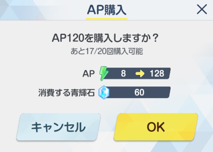 青輝石を使えば即時120回復できるが、日時で20回の制限があるのと要求される青輝石の量も増えていく。30個→60個→100個→・・・といった感じ。
