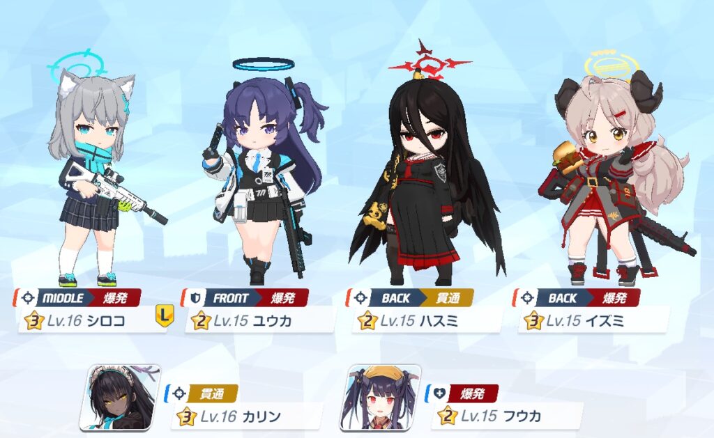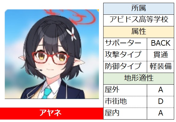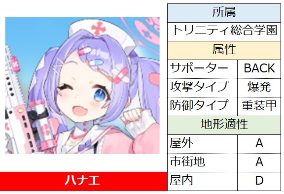 このキャラは持続系の回復持ちで、アタッカーよりのタンクであるホシノ、挑発スキル持ちのツバキとの相性が良い。回復に即時性がないので、FRONTキャラが複数編成の場合は運用しにくいか?