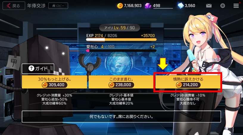 左を選ぶと「クレジット1.3倍」で愛社心50%アップ、大成功率が60%。一見すると左が良さそうに見えるけど、大成功しても経験値は1.2倍程度(しかも確実ではない)。愛社心は周回してれば上がっていくし…。