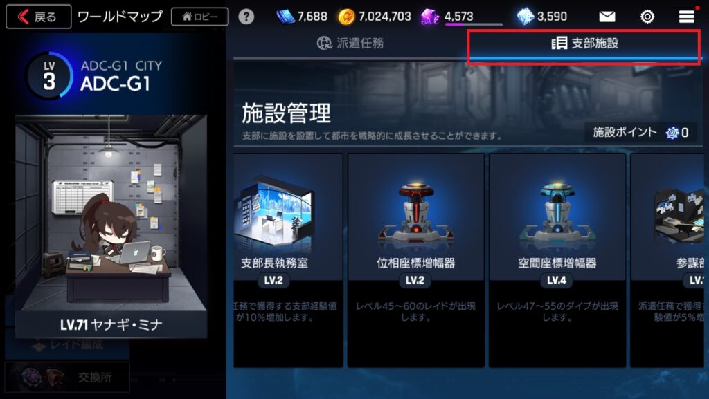 派遣任務の横に「支部施設」のタブがあり、ここで新しく施設を建設したりレベルアップしたりできる。赤い丸のマークがついてたら建設やレベルアップが出来るはずです。