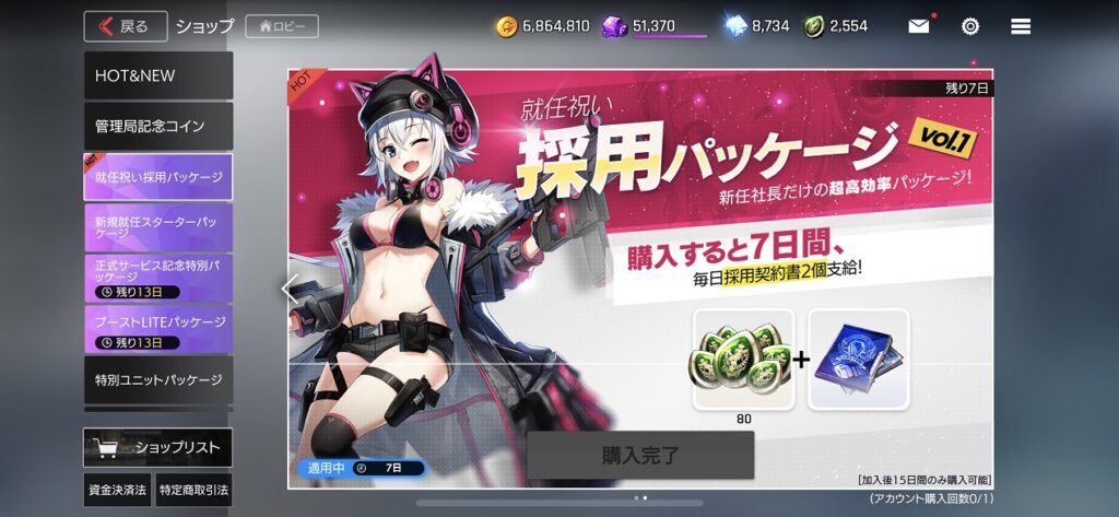 管理局記念コイン80と7日間2個ずつ採用契約書が貰えるパック