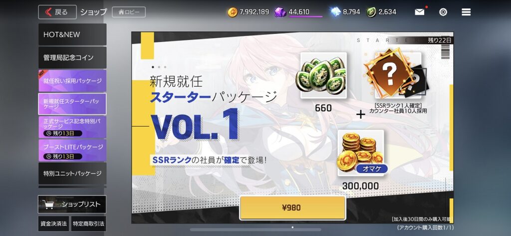 980円で管理局コイン・クレジット・SSR社員確定チケット(ランダム?)のパック。