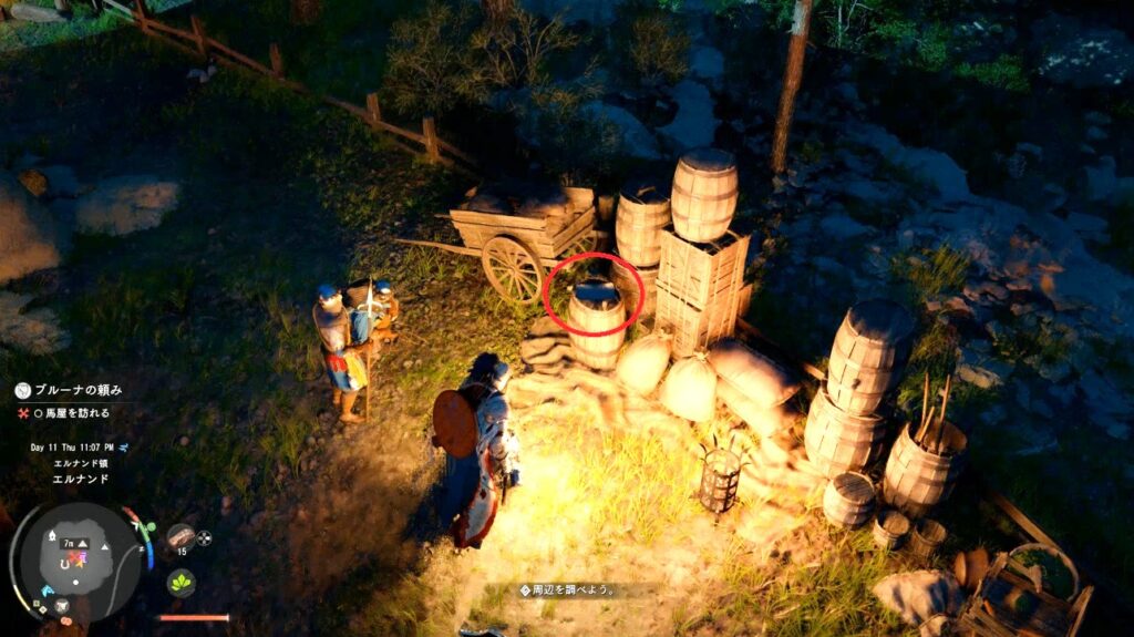 馬屋の裏(兵士が二人いるところ)の樽の上に馬具管理人のメモが置いてあります。