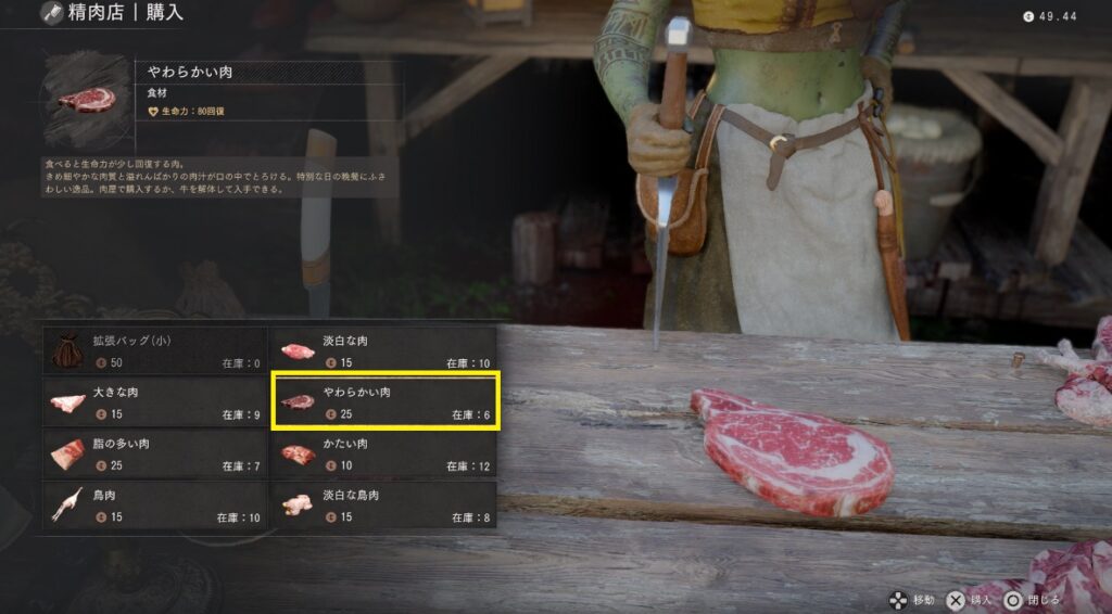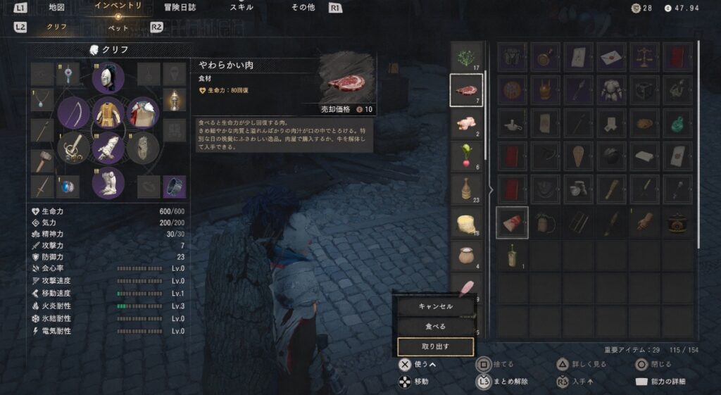 インベントリからやわらかい肉を選んでXボタン長押しで「取り出す」を選択