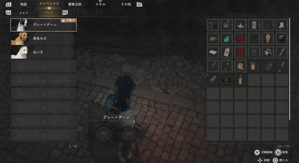 これでインベントリの項目にペットが追加され、以後は連れ歩けるようになります。ペットは敵を倒した際のドロップアイテムを自動で回収してくれる機能を持っているので、自分で必死に拾う作業が軽減できます。