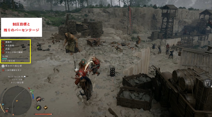 奪われた採石場は勢力クエストのロバーツ家で揺らぐ領地の項目を進めていくと出現するクエストです。大量の敵が溢れる制圧系のクエストとなっており、おそらくゲーム開始から初となる大規模な討伐クエストです。