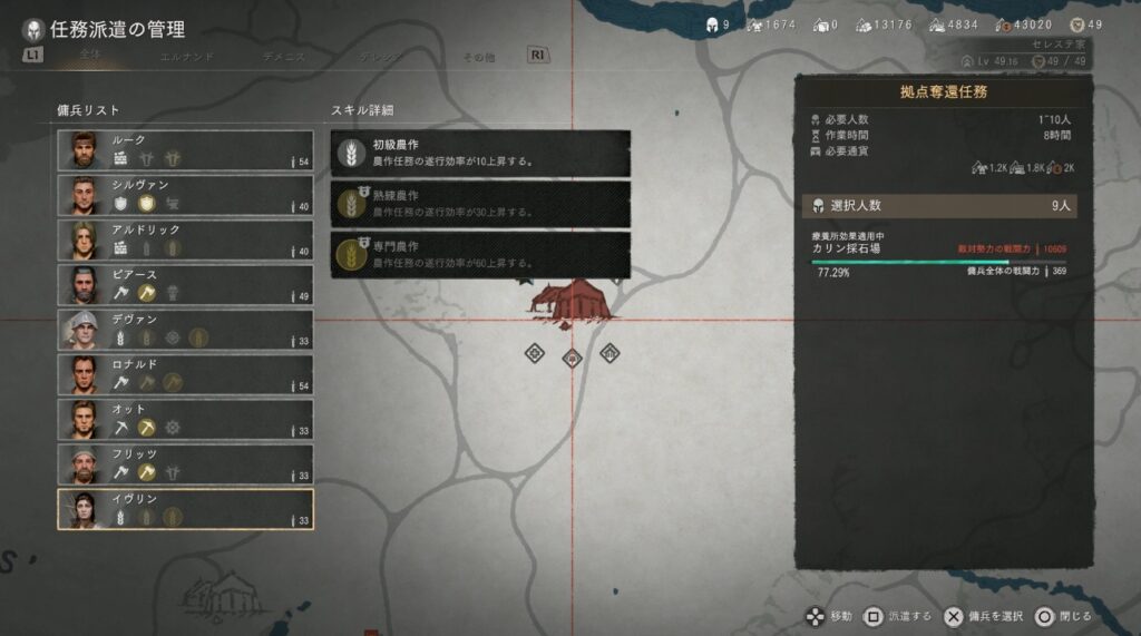 拠点の拡張を進めている人は任務派遣でカリン採石場での拠点奪還任務を同時進行する。これで仲間をカリン採石場へ送り込んでおくとパーセンテージの減りが早くなります。