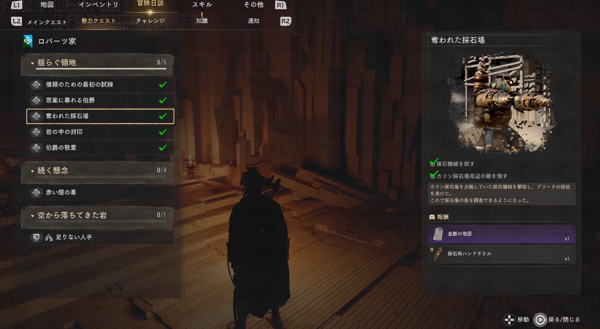 この後ロバーツ伯爵のところへ戻ると勢力クエスト「揺らぐ領地」がクリアになります。しかし、先ほどクレーンで石を取り出したところに地下の遺跡があるので見逃し注意です。
