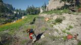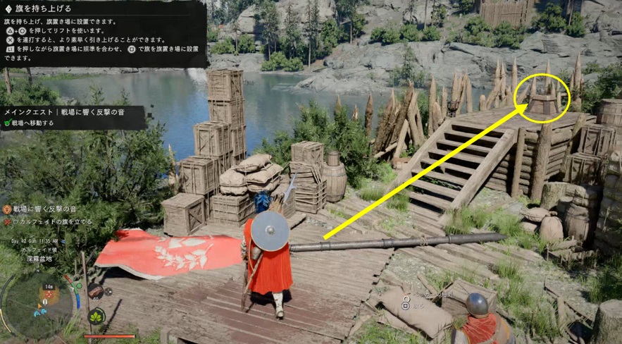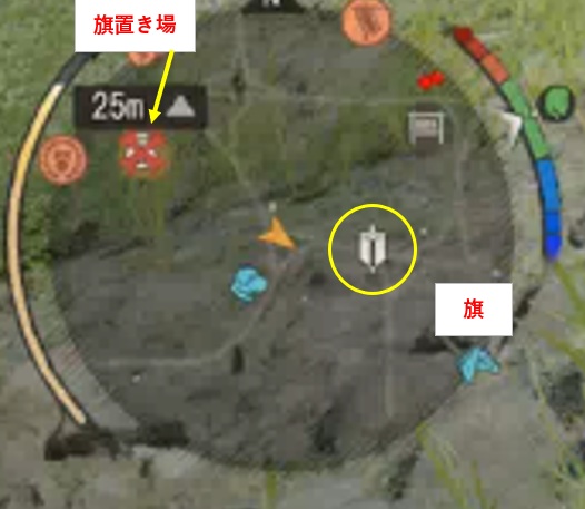 マップに目的地マーカーで表示されるのは旗置き場です。旗の方は近くにいくとミニマップに表示されます。3か所とも旗置き場の近辺に転がっているので探して差し込みましょう。