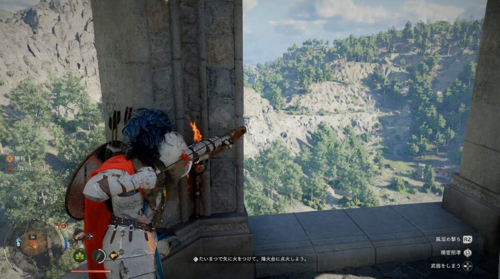 ※照準マーカーではなく矢の先です - 矢の先に火が点いているのを確認し中央部に撃つ
