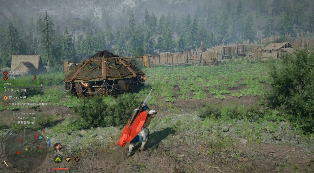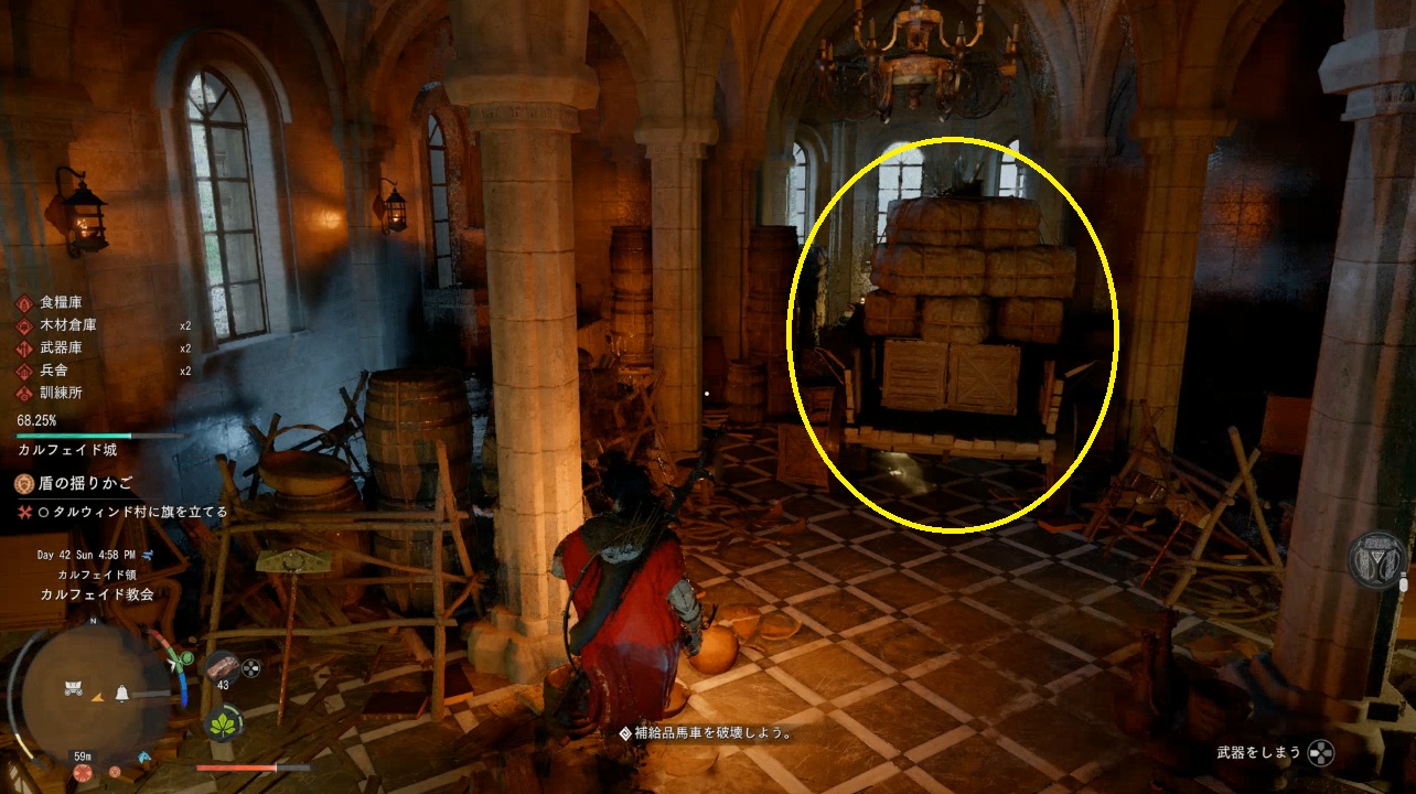 わたしは道中で壊してしまっていたようなんですが、補給物資の馬車ってのはカルフェイド教会の中においてある馬車のことだと思う。壊した後に会話シーンが差し込まれたので間違いないかな。