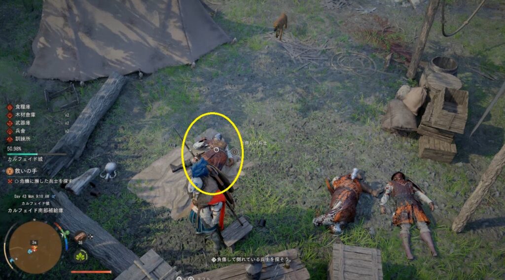 目的地で負傷した兵士を見つけ担いで補給所に連れ帰る。死んでるかと思いましたが、どうやらまだ生きているみたいです。