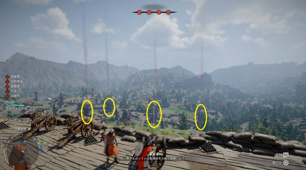 赤い煙が上がっている監視塔を破壊する。照準が赤くなった場所に撃てばOK(全部で4個)。