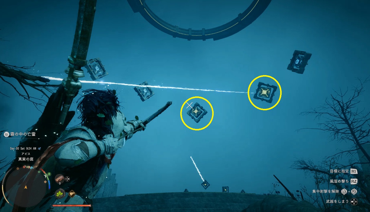 この後でもっと的が増えてくるので集中射撃ないとキツいんじゃなかな。集中射撃中は時間の流れが緩やかになり、複数の目標を同時に狙えます。
