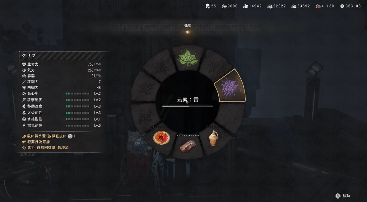 元素は十字キーの右ボタン長押しで設定できます。今後他の元素を手に入れた場合はこの画面から切り替えましょう。