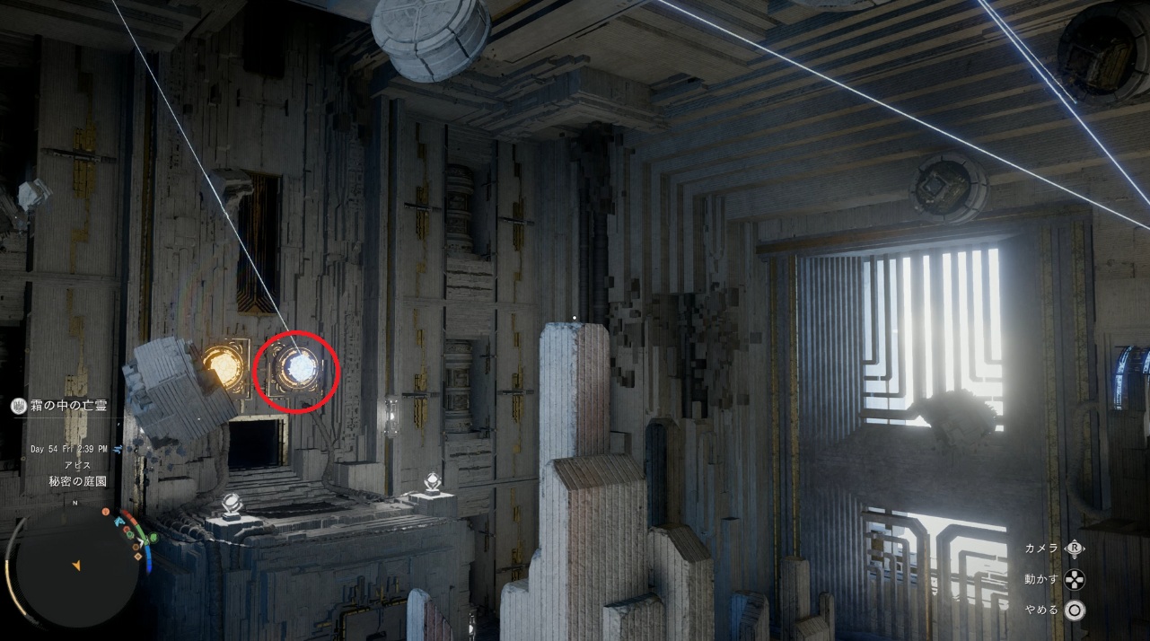 浮いているブロックをグレーのブロックの場所へ移動。反対側にも青いブロックが浮ていますので同様の手順を行ってください。これで中央の扉がアクティブになります。