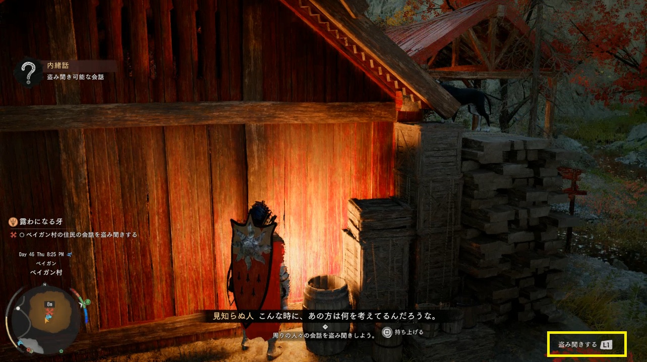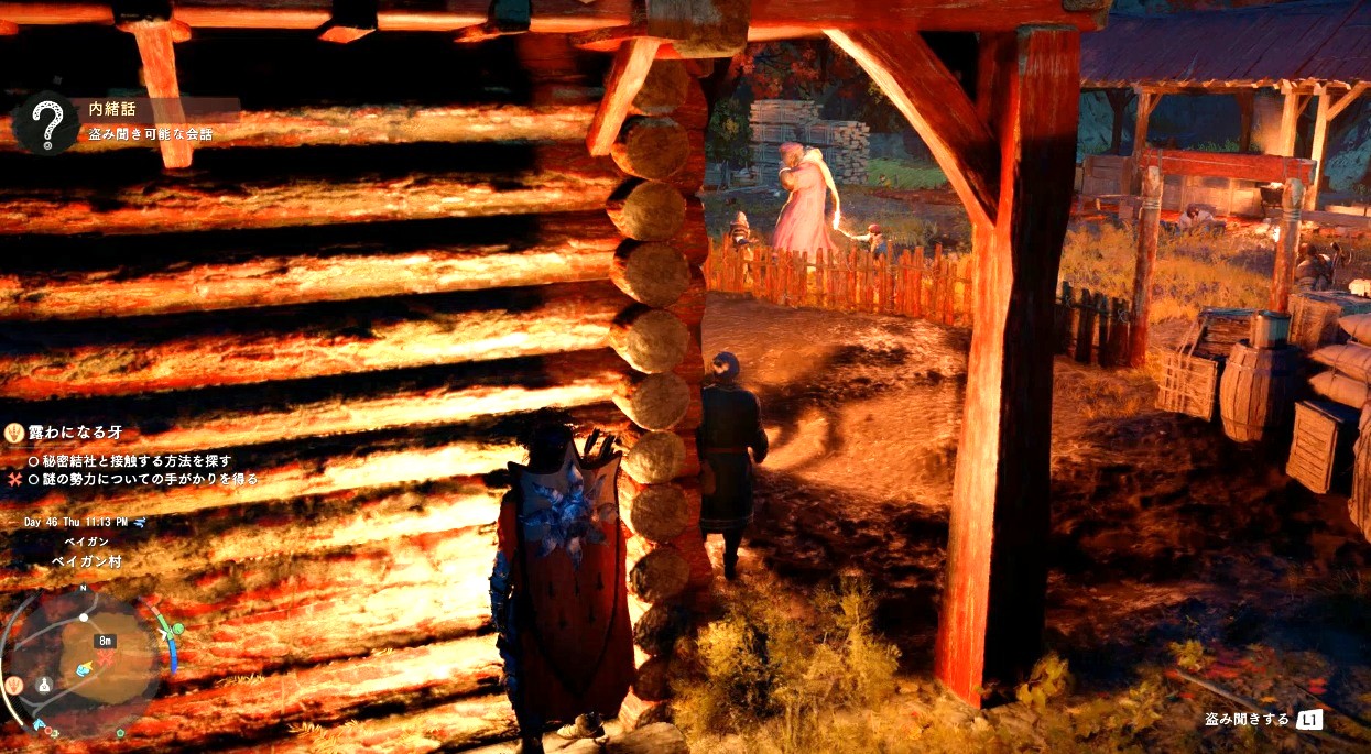 目的地に行って会話が聞こえる位置(相手からは見えない場所)にいく。画像のように建物の壁越しに聞く感じだとよい。すると、画面右下に「盗み聞きする」のコマンドが出るのでL1ボタンを押す。これで会話が進行し盗み聞きとなります。