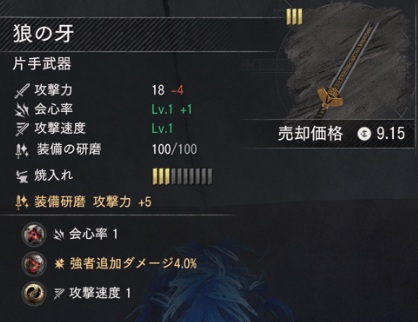 狼の牙ってのがジアンの剣です。[強者追加ダメージ4.0%]のアビスギアが付いています。