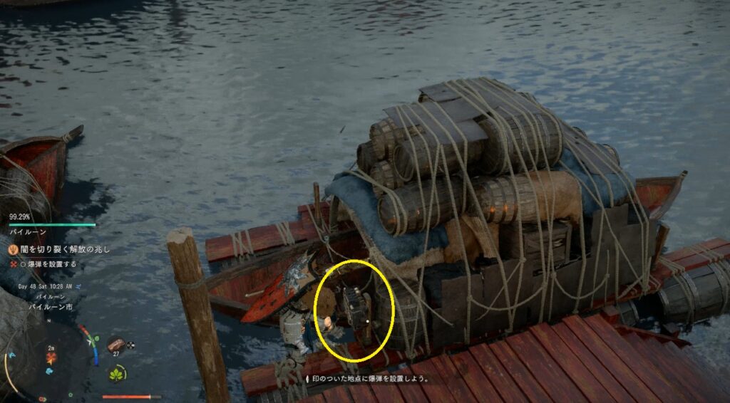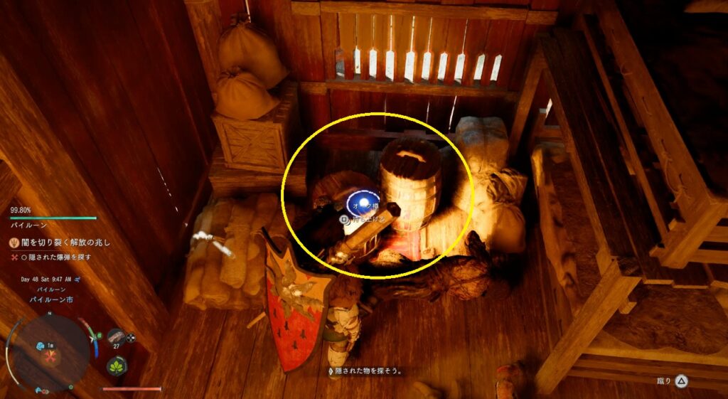 建物入口近くの樽の下に爆弾が隠されている。樽をどかして爆弾を回収しよう。