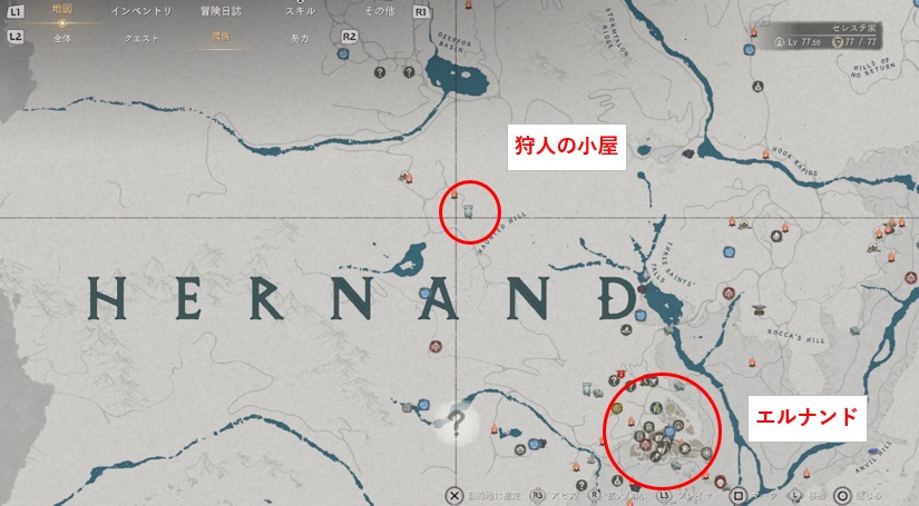 場所はエルナンドの街から北西方面へ進んだところ。クリアしてない場合は「?」の白いエリアで表示がされます。