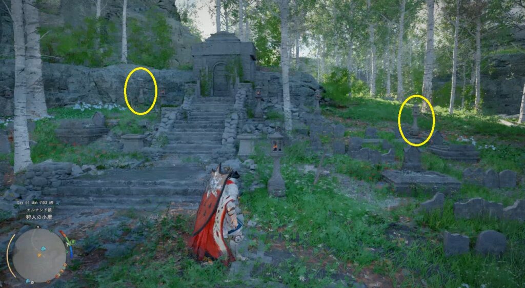 お墓の周囲に置いてあるランプ全てに火を点ける。デフォルトだと何か所か点いていないところがあるので、それに全部火を点ければクリアとなります。