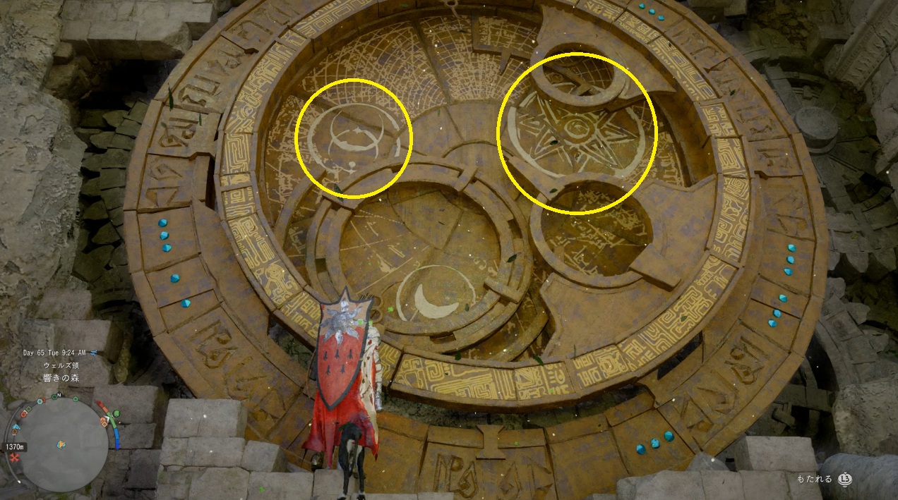 左は持つところが付いてませんので、装置に突き(L1+△ボタン)で武器を突き刺し持ち手代わりとします。武器を差したらそのまま回転させ小さい輪っかの部分をマークに重ねます。