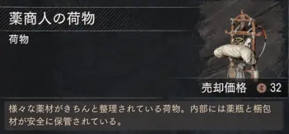 行商人の荷物って名前だけどアイコンが微妙に違って使えなかったりとか、薬商人の荷物みたいにそもそも全然違ったりとか…。