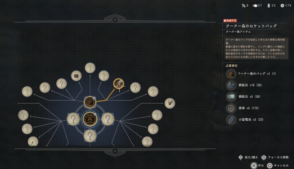 クリアの為に作成するものは【クークー鳥のロケットバッグ】です。ただ、必要素材として【クークー鳥のバッグ】が必要となるので、まずはバッグの方から作成しなくてはいけません。